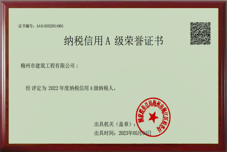 納稅信用A級榮譽(yù)證書